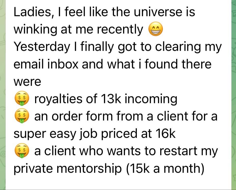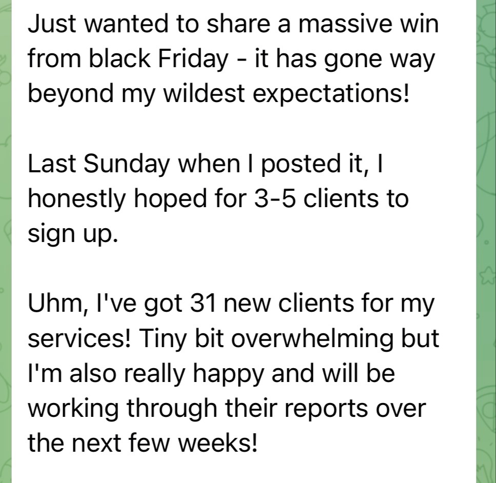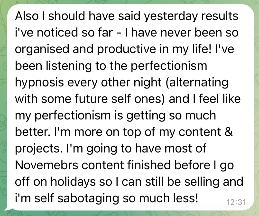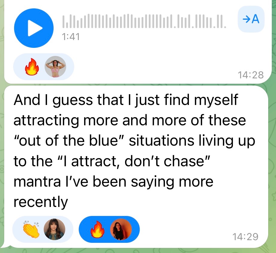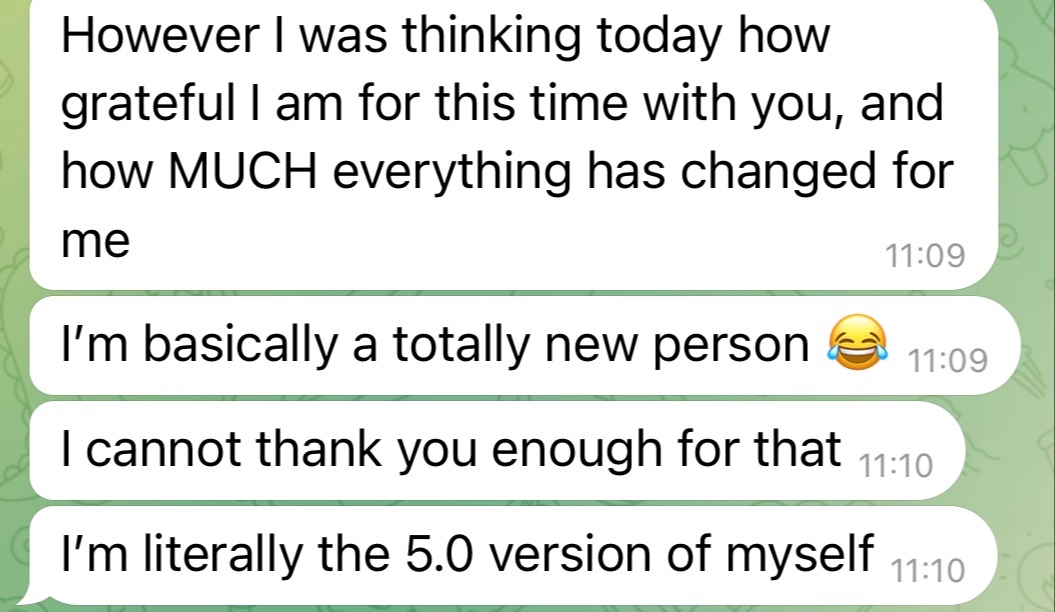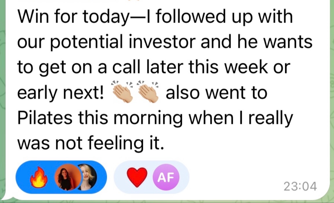Daily access to me in a group Telegram Monday - Friday for on-demand coaching and support to stay focused, accountable and in momentum